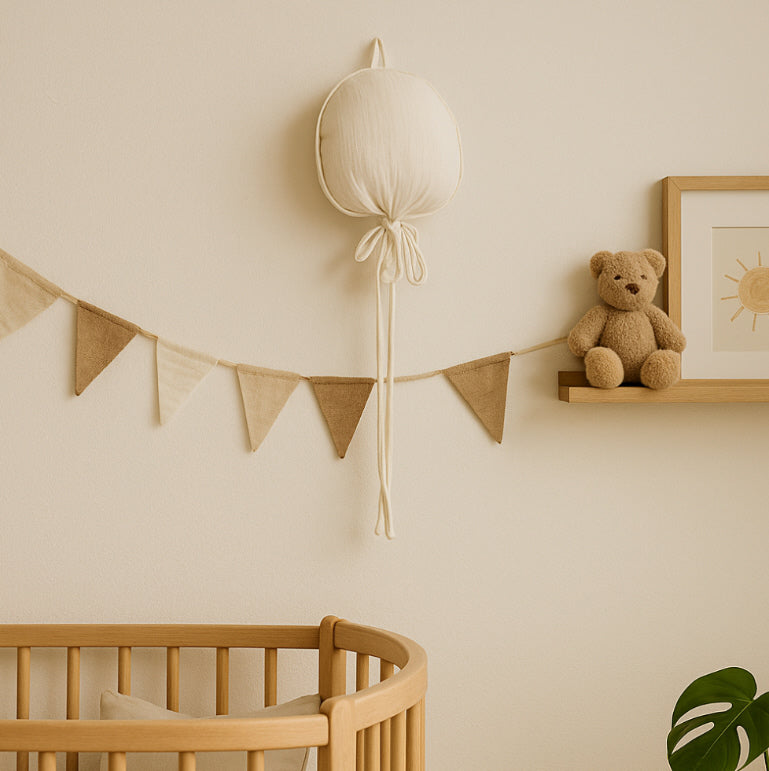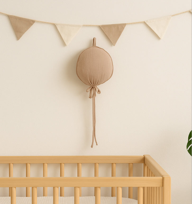 Der Ballon hat eine Länge von ca. 60 cm und eine Breite von ca. 20 cm und ist mit einer Schleife und langen Bändern versehen, was ihm ein elegantes Aussehen verleiht. Der Ballon ist in den ruhigen Naturtönen Beige, Sand und Armygrün (Khaki) erhältlich und lässt sich problemlos mit anderen Kinderzimmeraccessoires kombinieren. Perfekt als Wanddekoration, über dem Bett oder als verspielter Akzent an der Wand.